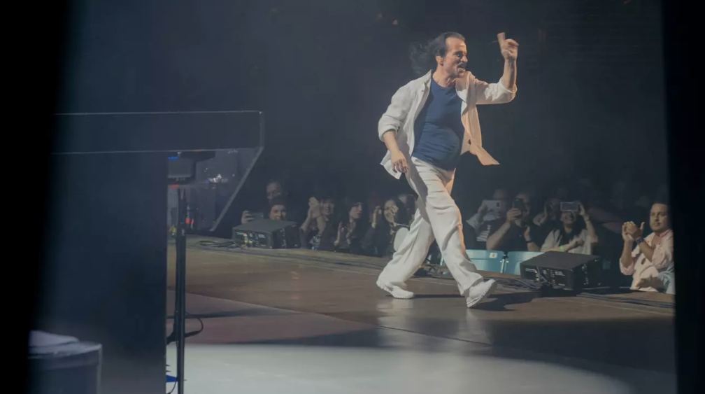 On offer on Saturday in Philadelphia was a steroidal rendition of songs from “Live at the Acropolis” and other records, running two and a half intermissionless hours; the 1993 concert clocked in at a tight 70 minutes. There was no orchestra this time, but the backing band dwelled on feverishly virtuosic solos — frenetic drums, shredding violins — as if to compensate for the lack of Acropolis-scale forces.